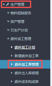 进入ERP系统之后,在左侧的功能菜单里找到“生产管理”,点开“委外加工管理”,点击“委外加工单管理”。