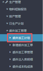 进入ERP系统之后,在左侧的功能菜单里找到“生产管理”,点开“委外加工管理”,点击“委外加工计划”。