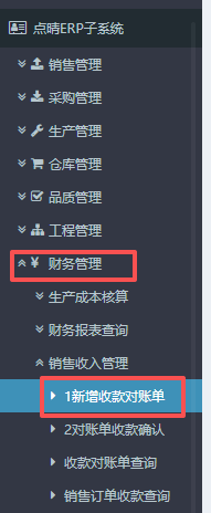 1.进入ERP系统之后,在左侧的功能菜单里找到“财务管理”,点开“销售收入管理”,点击“新增收款对账单”。