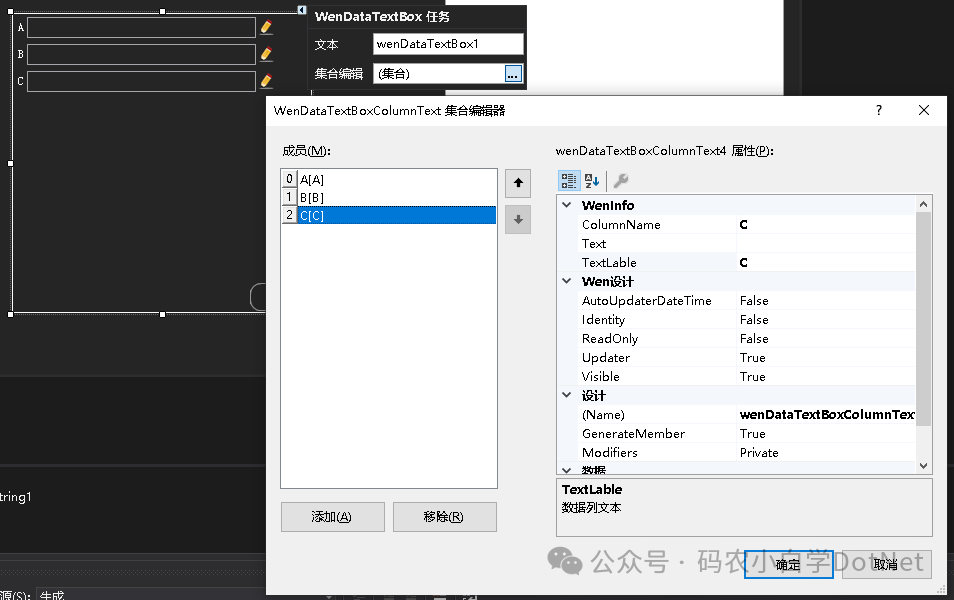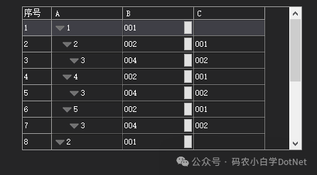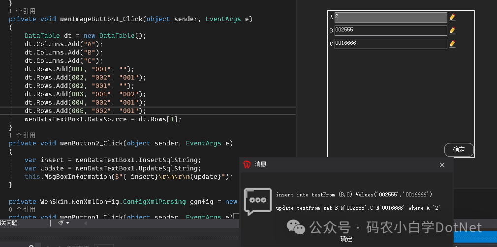 private void wenImageButton1_Click(object sender, EventArgs e){ DataTable dt = new DataTable(); dt.Columns.Add("A"); dt.Columns.Add("B"); dt.Columns.Add("C"); dt.Rows.Add(001, "001", ""); dt.Rows.Add(002, "002", "001"); dt.Rows.Add(002, "001", ""); dt.Rows.Add(003, "004", "002"); dt.Rows.Add(004, "002", "001"); dt.Rows.Add(005, "002", "001"); wenDataTextBox1.DataSource = dt.Rows[1];}private void wenButton2_Click(object sender, EventArgs e){ var insert = wenDataTextBox1.InsertSqlString; var update = wenDataTextBox1.UpdateSqlString; this.MsgBoxInformation($"{ insert}\r\n\r\n{update}");}