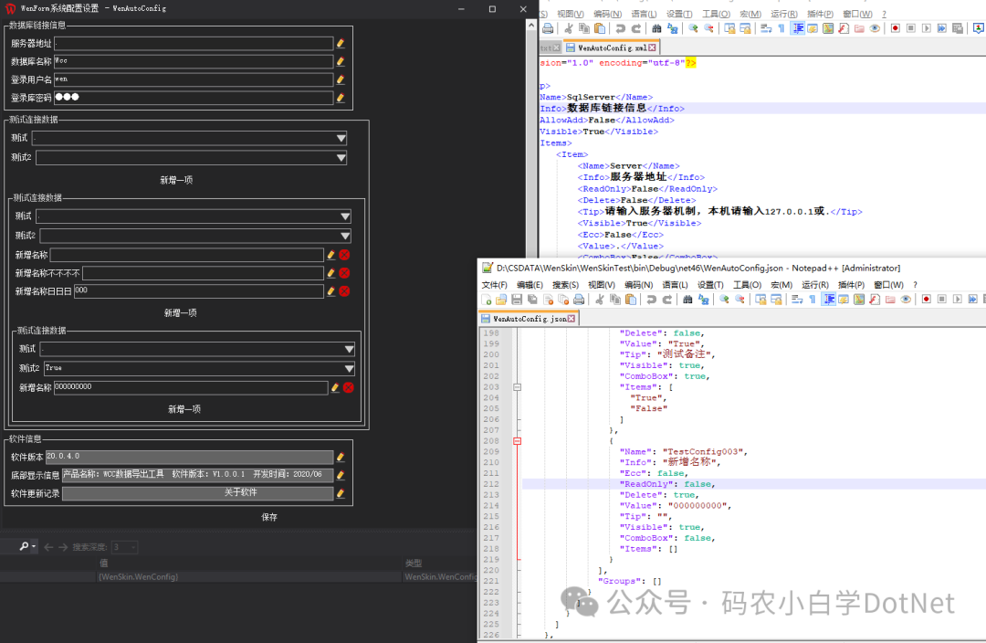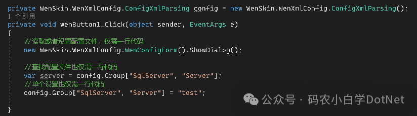WenSkin.WenConfig wenConfig = new WenSkin.WenConfig();WenSkin.WenConfig wenConfigjson = new WenSkin.WenConfig(WenSkin.WenConfig.ConfigFormatEnum.Json);var uid = wenConfig["SqlServer", "Uid"];wenConfig["SqlServer", "Uid"] = "wen";wenConfig.Show();