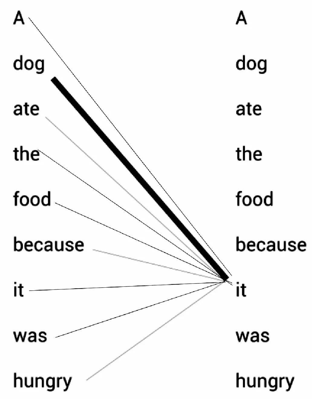 例句中的代词 it(它)可以指代 dog(狗)或者 food(食物)。当读这段文字的时候,我们自然而然地认为 it 指代的是 dog,而不是 food。但是当计算机模型在面对这两种选择时该如何决定呢?这时,自注意力机制有助于解决这个问题。