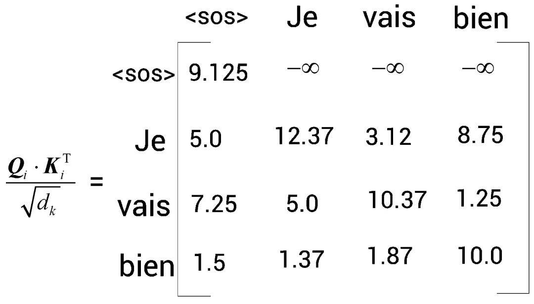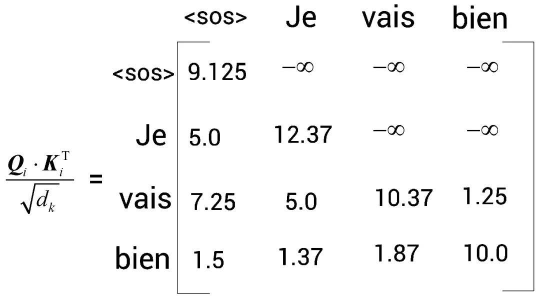 (good)的点积。因此,第1行表示目标词<sos>与原句中所有的词(I、am和good)的相似度。
