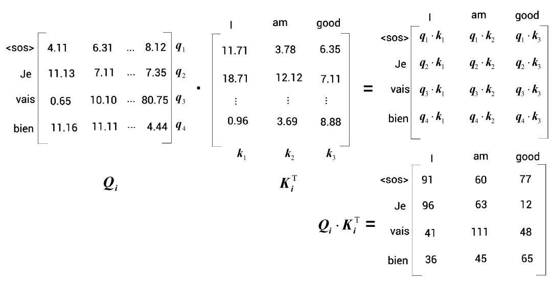 (good)的点积。因此,第 2 行表示目标词 Je 与原句中所有的词(I、am 和 good)的相似度。