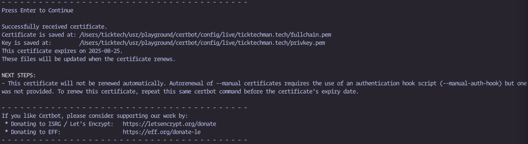 在申请证书的过程中,cbot需要验证域名的所有权是否属于你,提供了三种方式:在我们的场景中,网站还不存在,因此选择通过DNS-01的方式来验证域名归属权。执行下面的命令:mkdir certbot && cd certbotmkdir config logs workcertbot certonly --manual --preferred-challenges dns -d ticktechman.tech --config-dir=${PWD}/config --work-dir=${PWD}/work --logs-dir=${PWD}/logs
