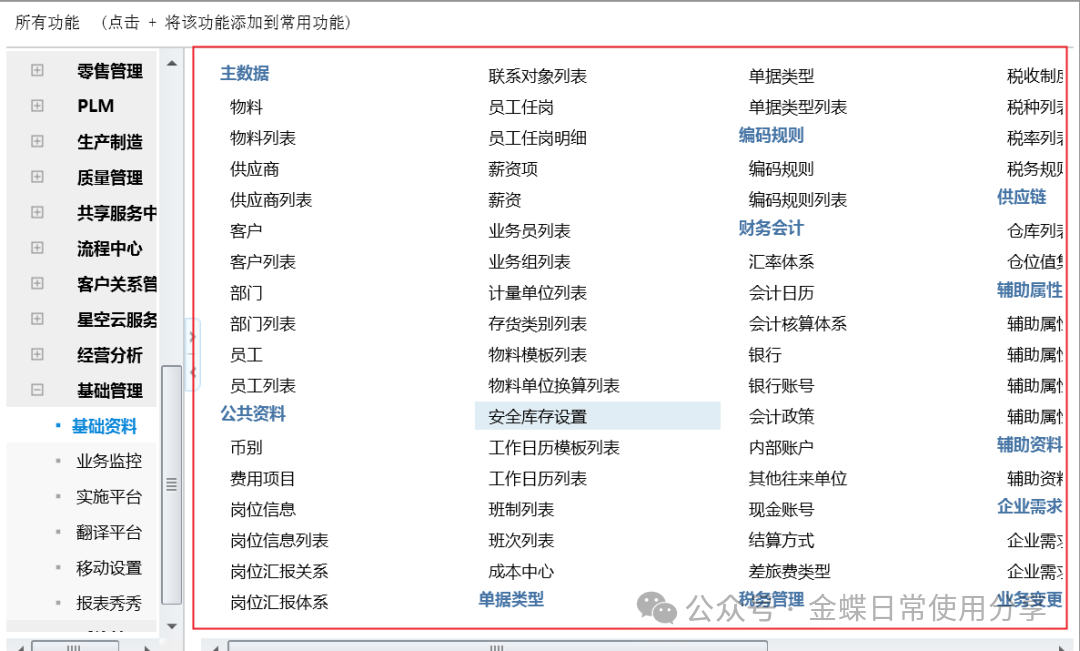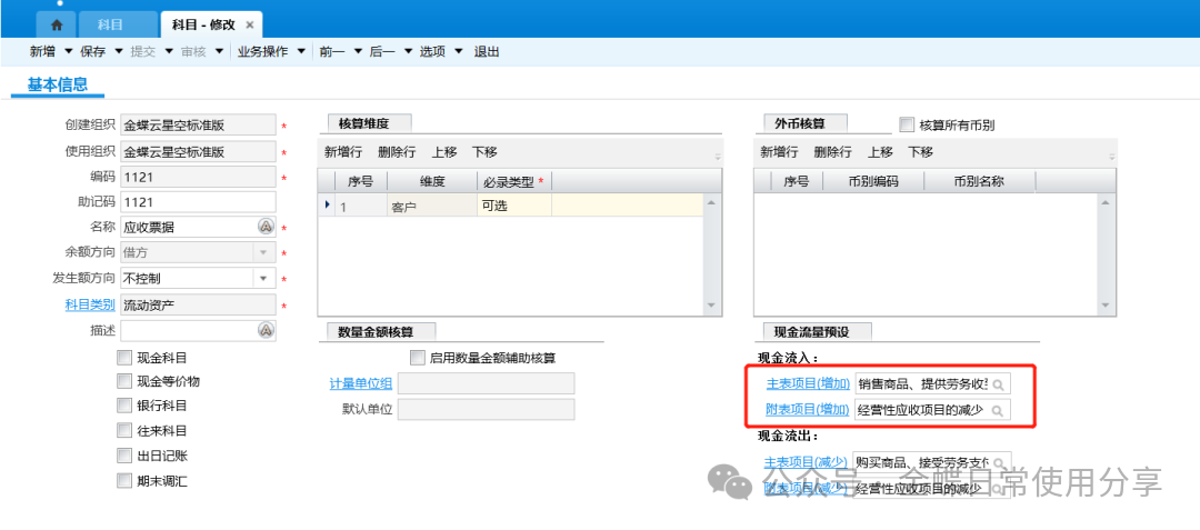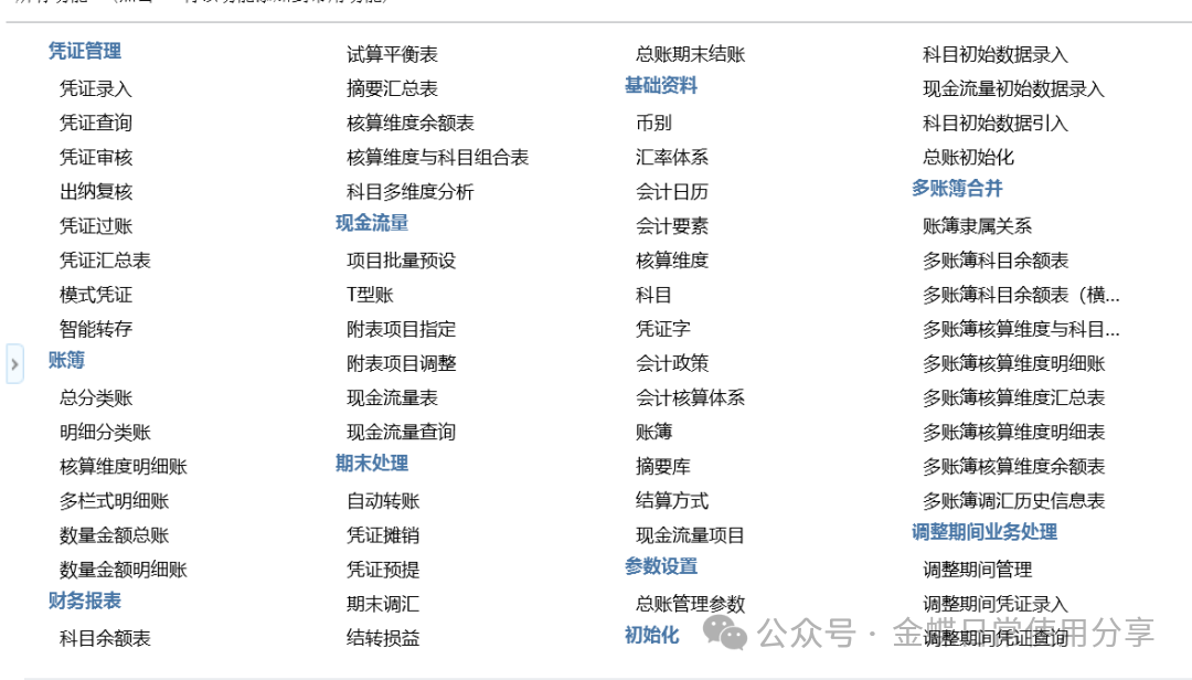 【操作说明】:包括:会计政策、会计核算体系、币别、汇率体系、会计日历、会计要素、核算维度、科目、凭证字、账簿、摘要库、结算方式、现金流量项目等,该部分公用基础资料的设置可参考总账初始化指南。