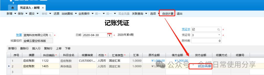 4.录入科目对应的借方或贷方金额。若已有一方金额,鼠标定格在另一方金额的单元格中,点击【自动计算】,根据借贷平衡原理,系统会自动计算出另一方的金额;