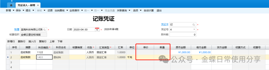 8.当会计科目要进行数量金额核算时,系统会自动弹出单价、数量格式让用户录入相关信息;