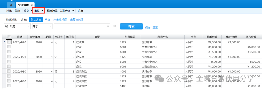 业务场景】:编制完凭证后,如果对凭证信息确认无误,用户则可对凭证进行审核。