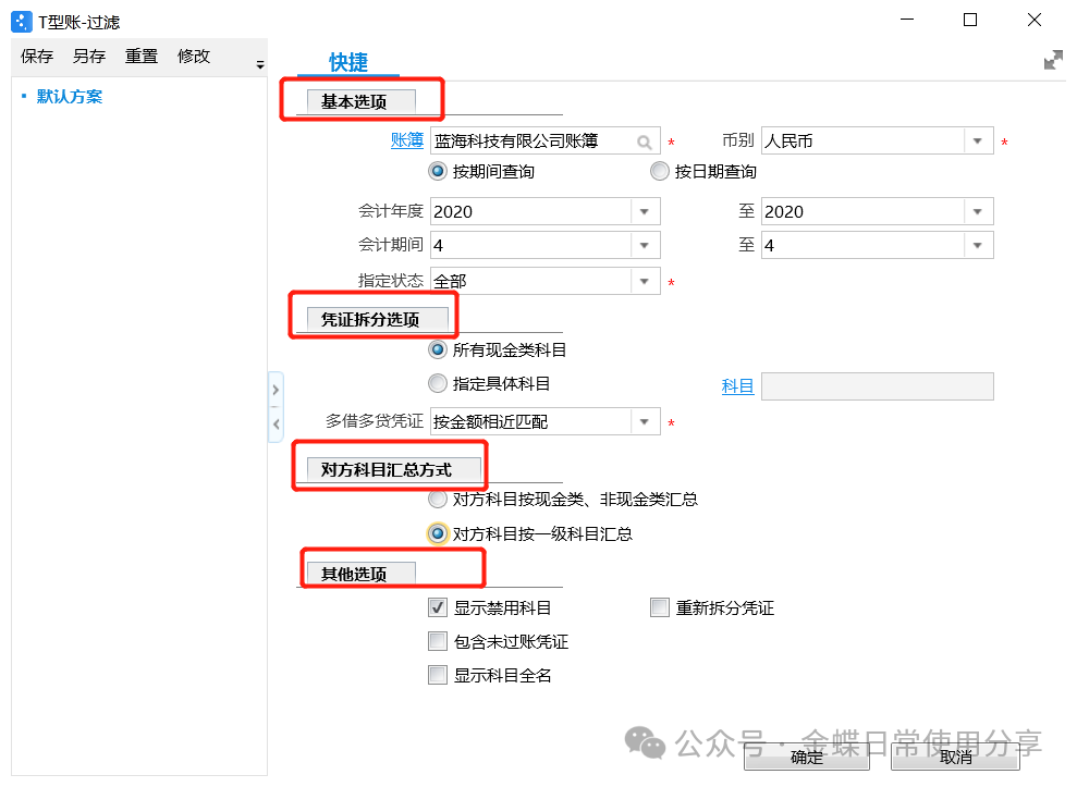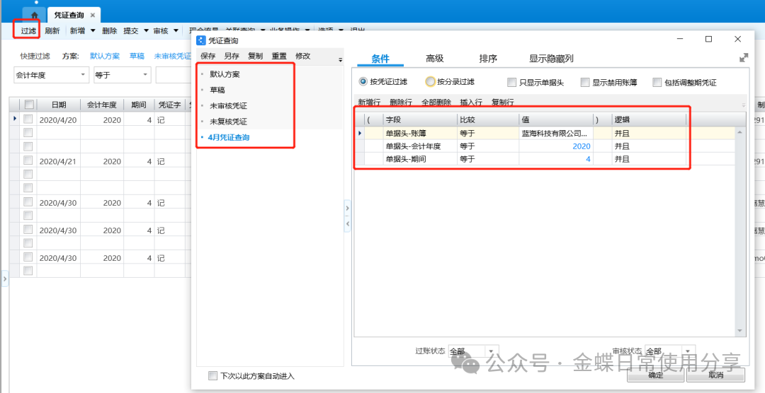 2.在过滤方案里,选择账簿、多栏式方案、会计年度、期间等信息进行查询;