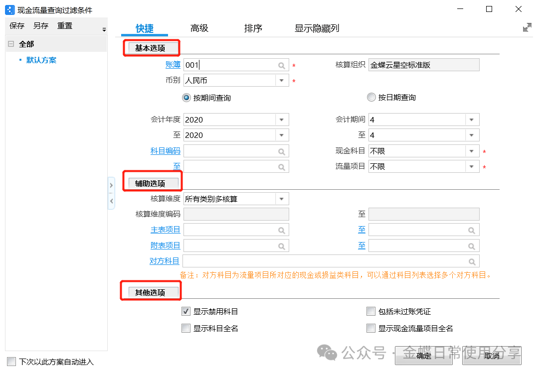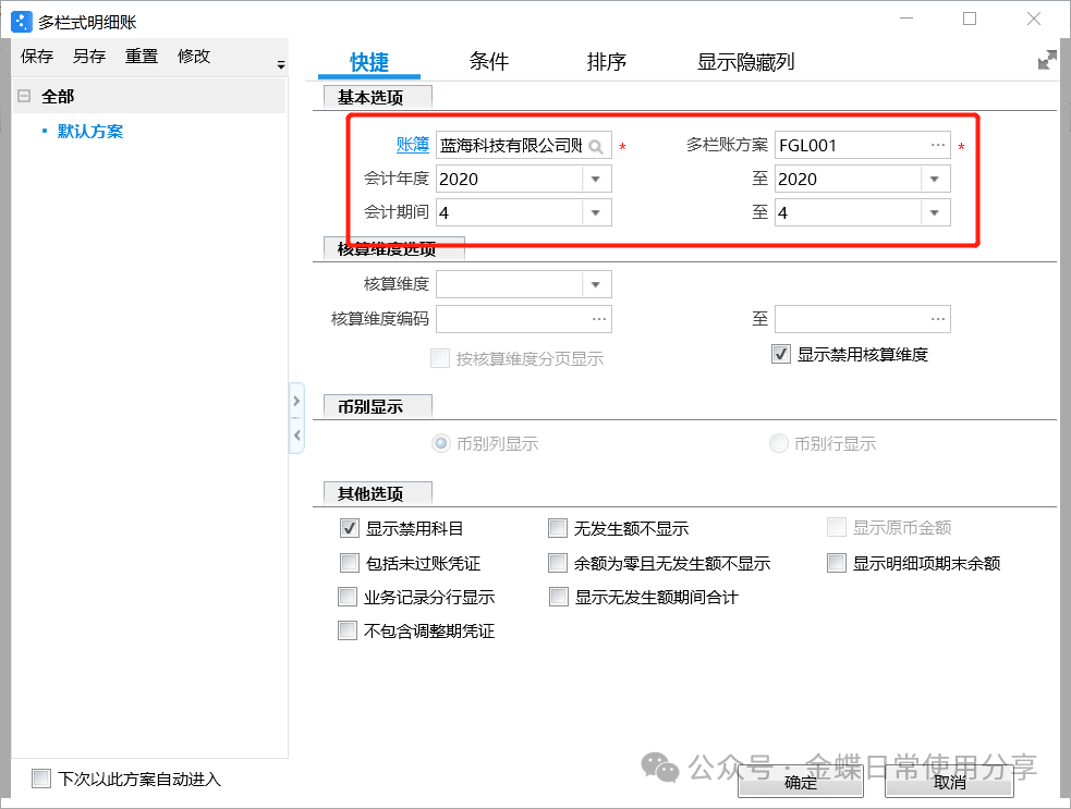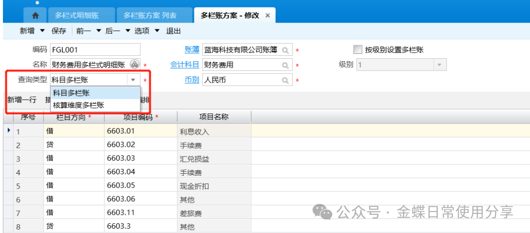 1.用户第一次进入多栏式明细账需新增“多栏式方案”,可根据实际情况设置多栏式明细账的格式,包括账簿、查询类型以及查询项目等;