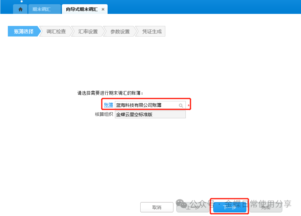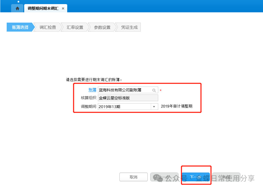 1.账簿选择:选择账簿、调整期间,点击【下一步】,在“选择账簿”页签显示“调整期间”字段,该字段下拉列表显示账簿在当前会计期间之前所有未关闭的调整期间;