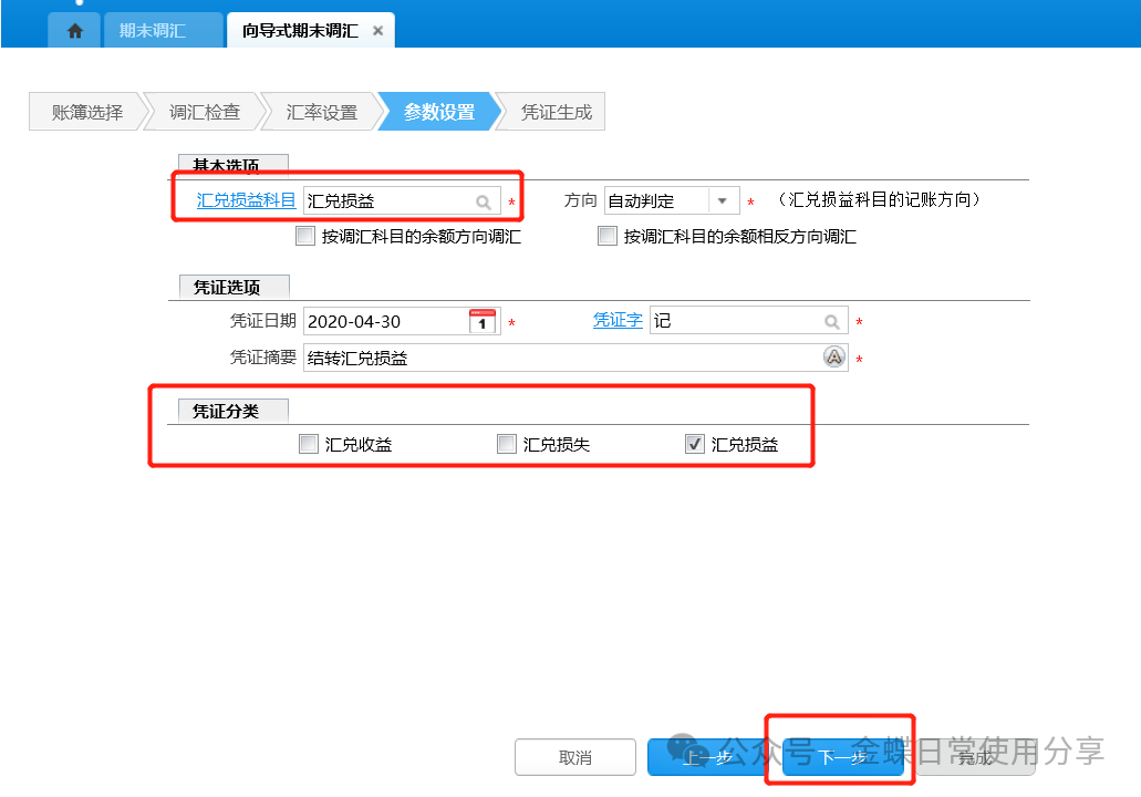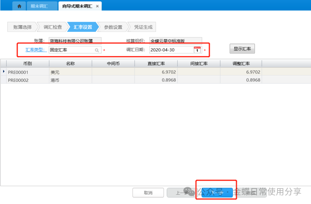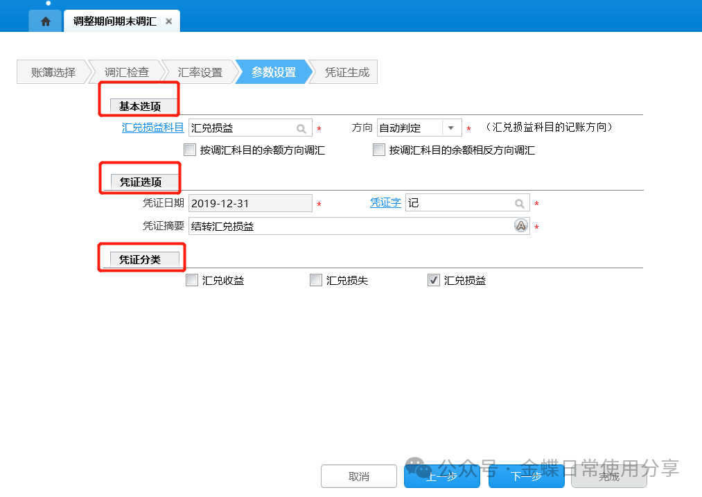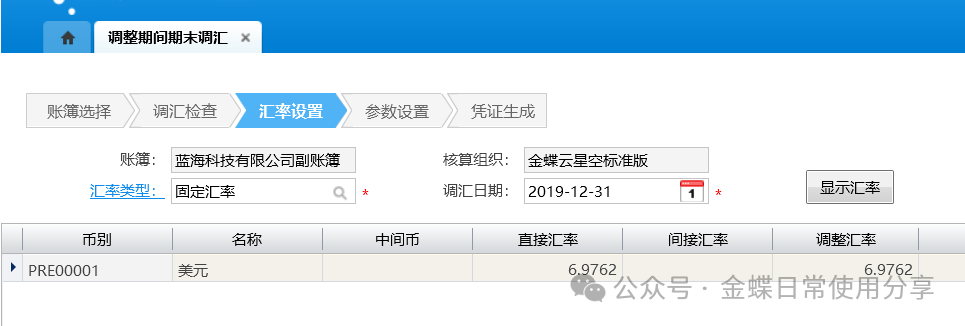 2.汇率设置、参数设置与正常期末调汇类似,具体可参考5.4期末调汇;汇率日期和凭证日期默认为调整期间所在会计年度的会计日历的最后一天,且不允许修改,选择调整期间后在其后面显示调整期间的名称;