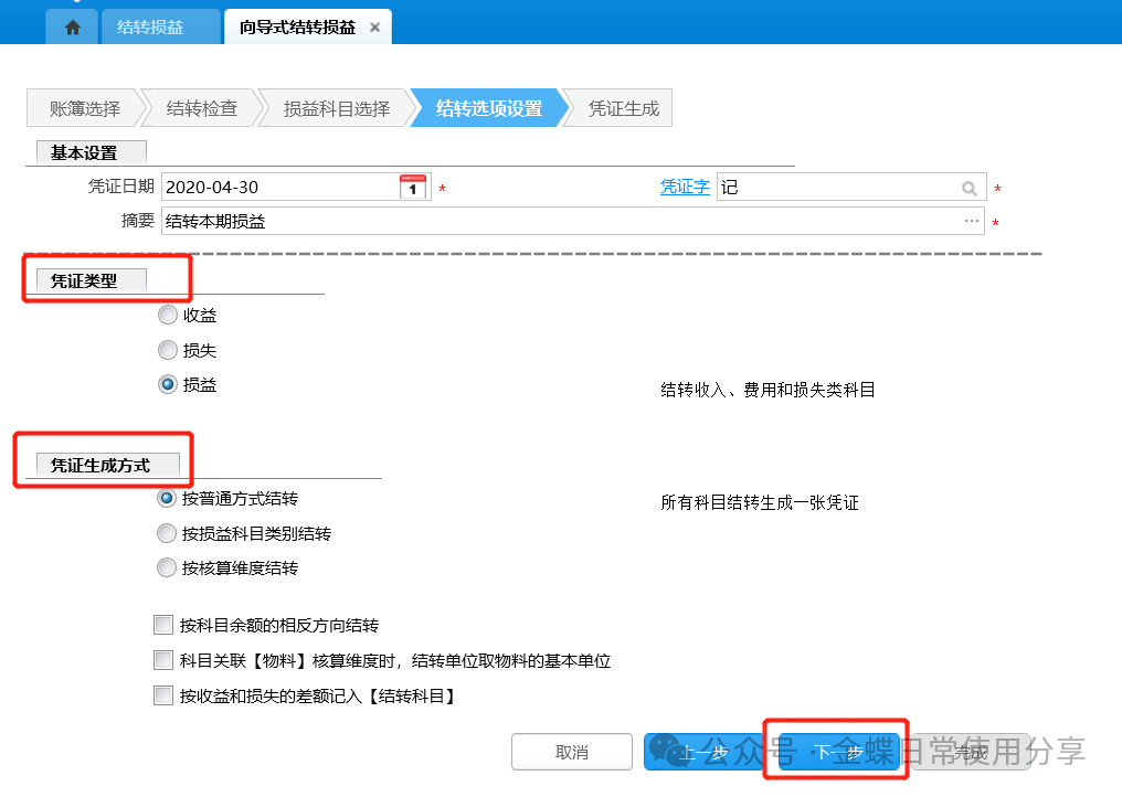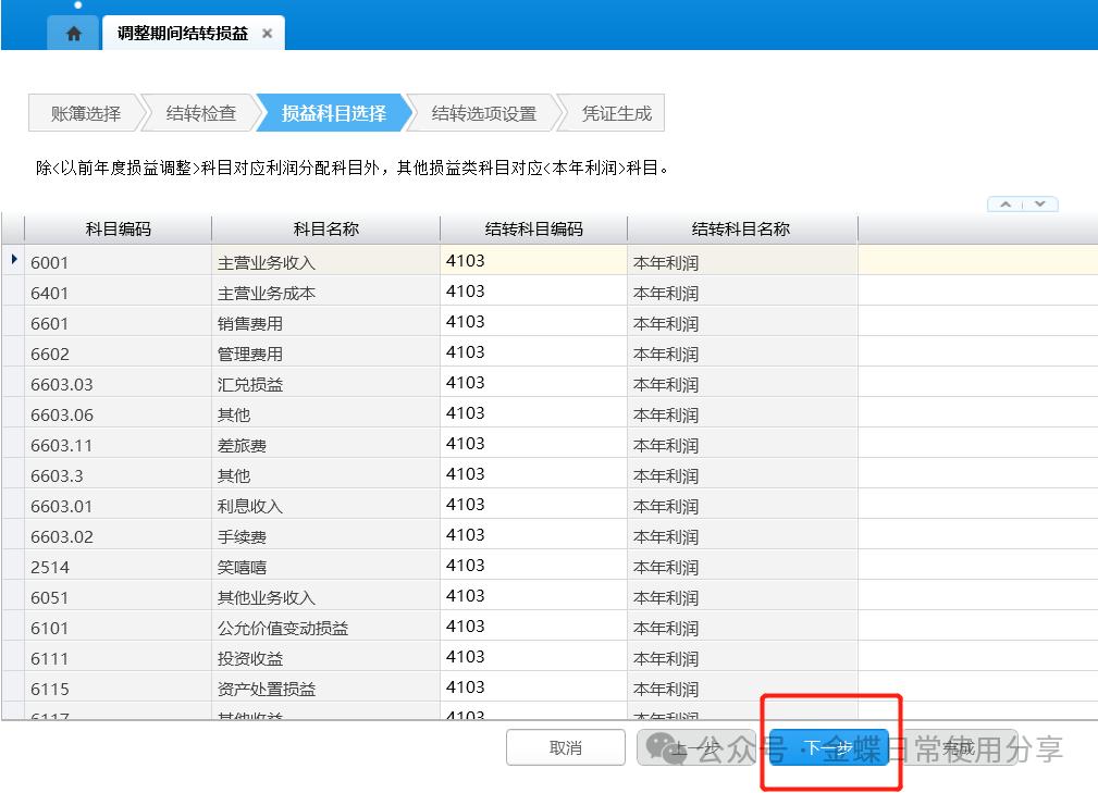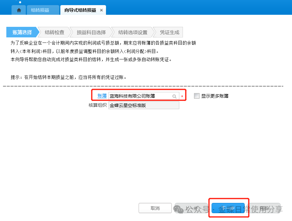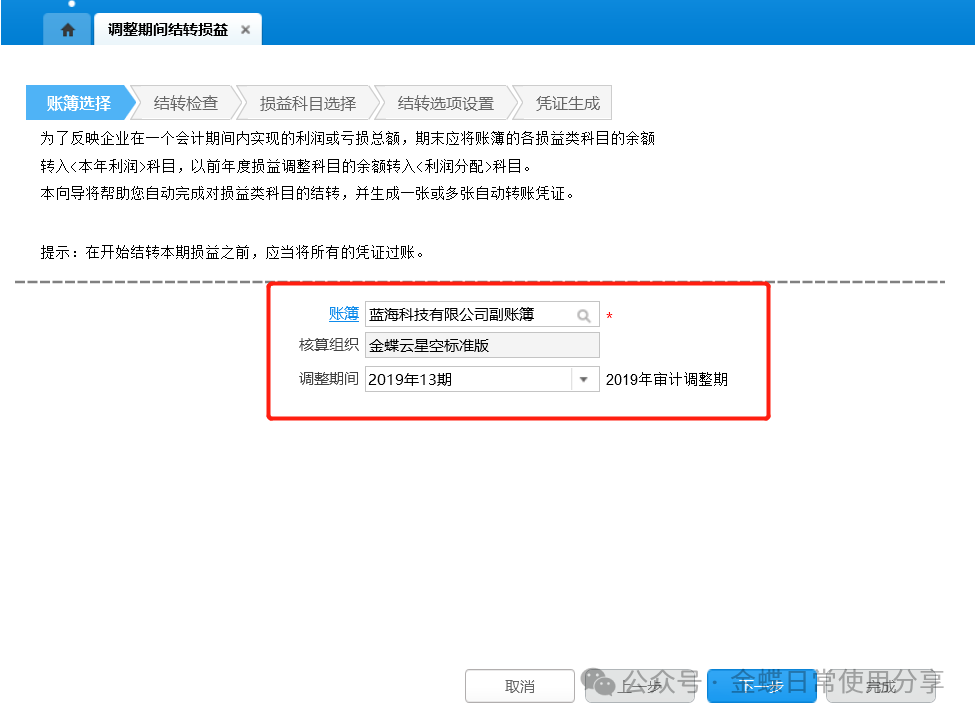 1.账簿选择:选择账簿、调整期间,点击【下一步】,结转损益界面的调整期间下拉列表显示账簿在当前会计期间之前所有未关闭的调整期间;