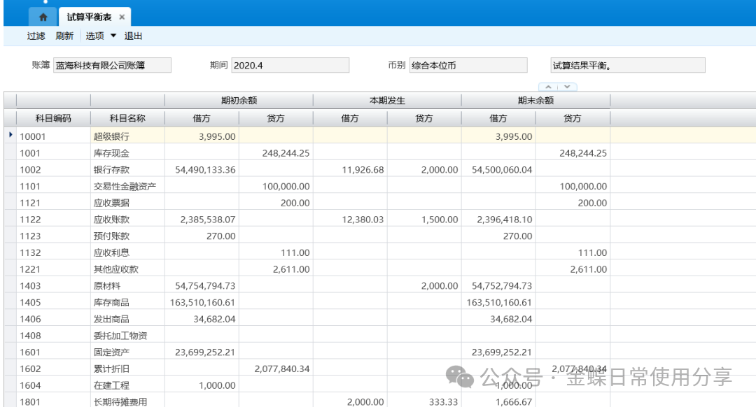 业务场景】:试算平衡表,用于输出和查询所选期间的各科目的期初余额、本期发生额及期末余额数据。用户可以查询账簿内不同的会计期间以及不同币别的试算平衡表数据。
