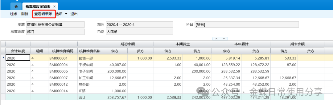业务场景】:核算维度余额表用于帮助用户进行核算维度余额的分析,主要展示核算维度的期初余额、本期发生、本年累计发生以及期初余额数据等。