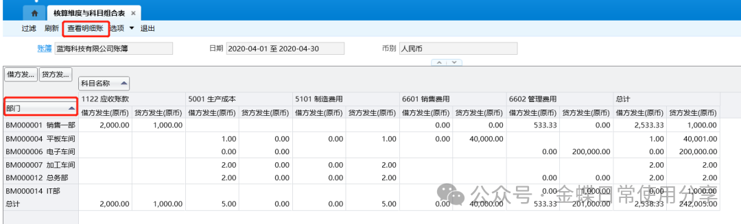 操作说明】:查询核算维度与科目组合表