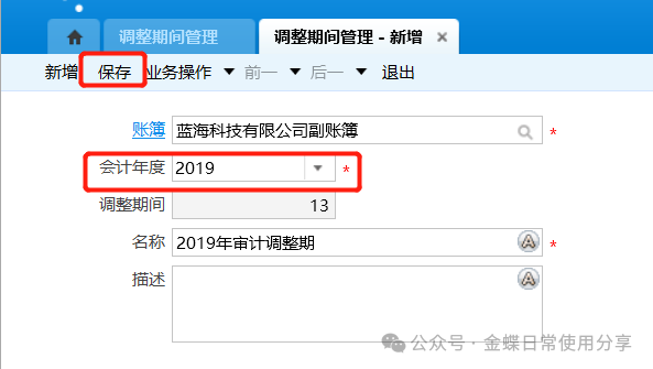 1.点击【新增】按钮,选择相应的账簿和会计年度,点击【保存】按钮;调整期间的名称的默认值为“[会计年度]年审计调整期”;