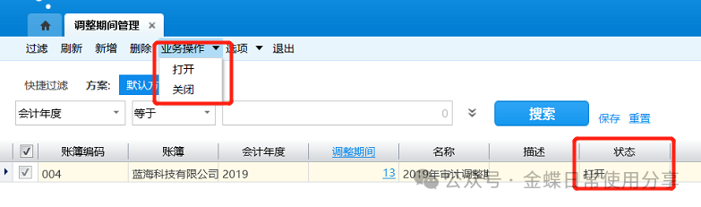 2.系统显示当前用户有调整期间查看权限的组织对应账簿的所有调整期间,默认按账簿、会计年度、调整期间进行排序。账簿的调整期间一旦保存,则视为启用(状态为“打开”),只有关闭后,才不允许录入已关闭期间的调整凭证;