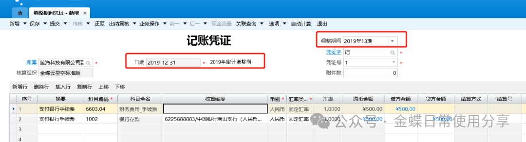 1.和普通凭证录入实现一致,标题显示“调整期间凭证录入”,在日期下面增加“调整期间”下拉列表,用来选择要录入凭证的调整期间。凭证信息录入完毕且无误后,点击【保存】、【提交】、【审核】;