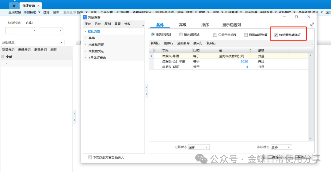 2.在普通凭证查询过滤界面的条件页签增加“包含调整期间凭证”选项,默认不勾选,当用户具有调整期间凭证的查看权限时,这个选项才显示。勾选后在凭证列表可以查询所有凭证,否则只能查询非调整期间的凭证;