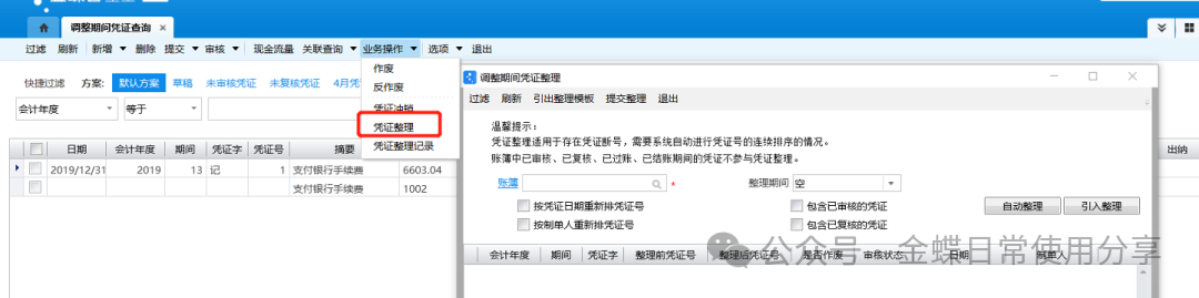 4.凭证整理,支持调整期间的凭证号整理,整理期间下拉列表中显示所有未关闭且有凭证的调整期间,整理期间的默认值还是账簿的当前期间;