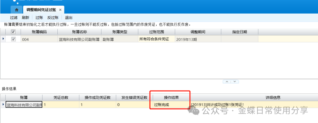 调整期间凭证过账界面不显示“当前会计期间”,显示“调整期间”列。
