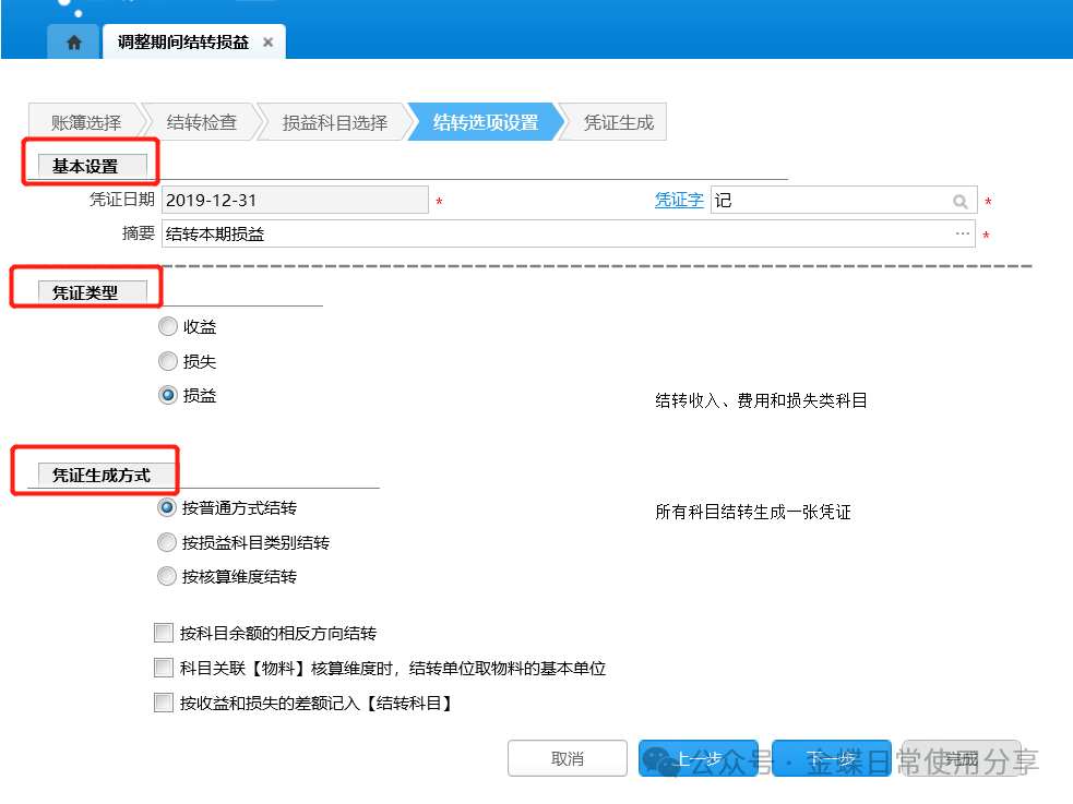 2.结转损益的前提检查、凭证生成逻辑同正常会计期间一致,只是结转的范围为用户所选择的调整期间;凭证日期默认为调整期间所在会计年度的会计日历的最后一天,且不允许修改,选择调整期间后在其后面显示调整期间的名称;