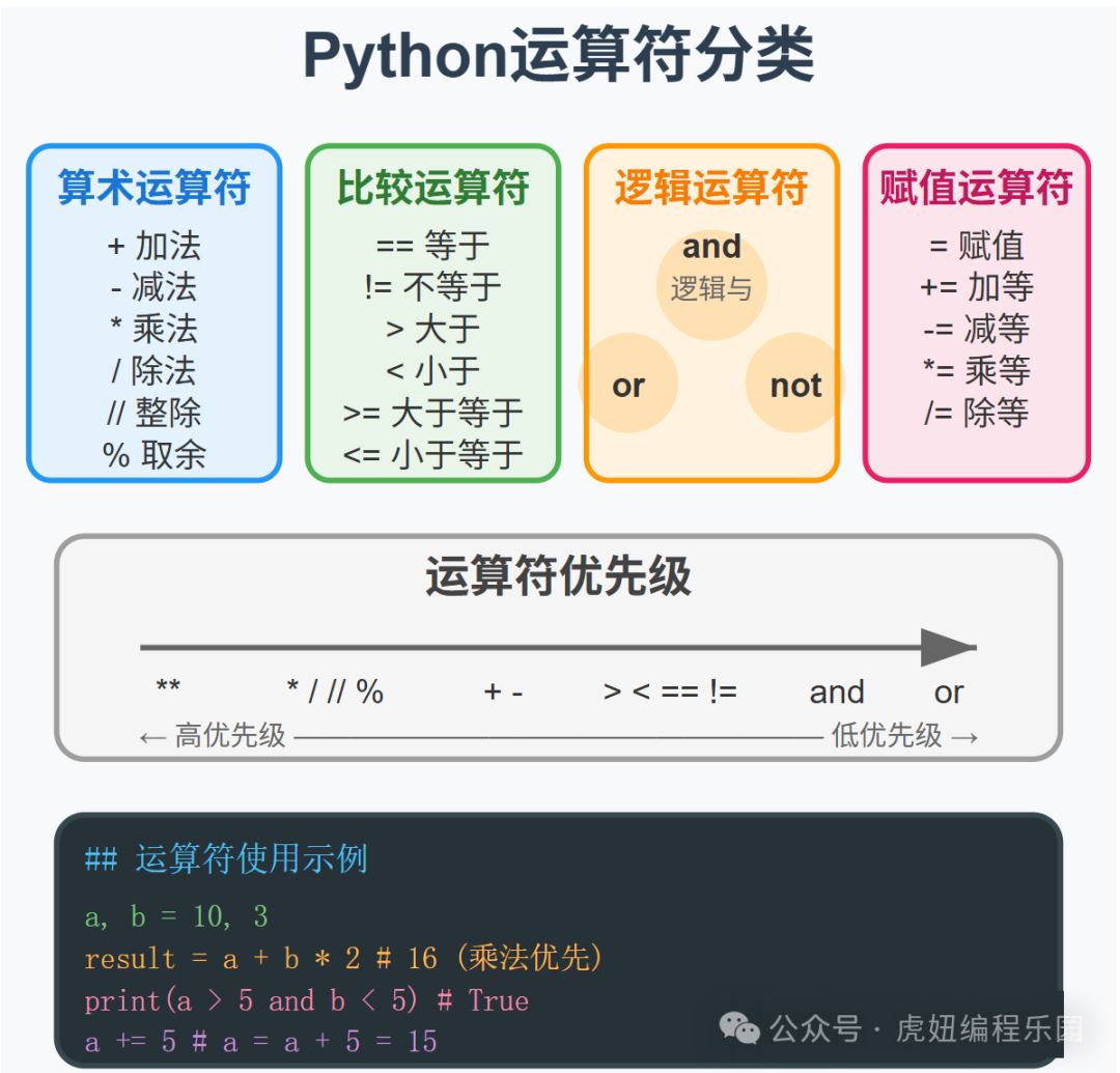 你是不是曾经想学编程,但一看到密密麻麻的代码就头皮发麻?🤯 相信我,我完全懂这种感觉。但其实,选对语言真的很重要——而Python,绝对是入门编程最友好的选择! 今天我就用最白话的方式,带你图解Python基础语法,保证你看得懂、学得会! 为什么Python这么受欢迎? Python的创始人吉多·范罗苏姆在1989年创造了这门语言,没想到如今它能火遍全球!它的设计理念就一句话:代码要写得像读英文一样简单。 这么说吧,如果用其他编程语言写程序需要10行代码,用Python可能只需要3-4行。就像你用手机快捷键一样,一键搞定复杂操作! Python还能跨平台使用,无论是在Windows、Mac还是Linux上都能运行。更重要的是,它有超多的现成工具库(标准库),让你不用从头造轮子。想要处理数据?画个图表?做网站?通通有现成的解决方案! 对了,Python的社区特别活跃,这意味着你遇到问题时,总能找到人帮忙。从Web开发到数据分析,从人工智能到自动化办公,Python几乎无处不在。 变量:数据的“容器” 想象一下,变量就像你家里的收纳盒,你可以往里面放东西,并给每个盒子贴个标签。 在Python中,你不需要事先声明这个盒子要放什么类型的东西,直接放就行——Python会自动识别。 比如: 取变量名有几个规矩:不能以数字开头,只能包含字母、数字和下划线,大小写是不同的,还有不能用Python的保留关键字(比如不能直接叫“print”)。 数据类型:东西分门别类 ![]() 就像超市里商品要分类摆放一样,数据也分不同类型: