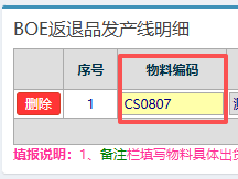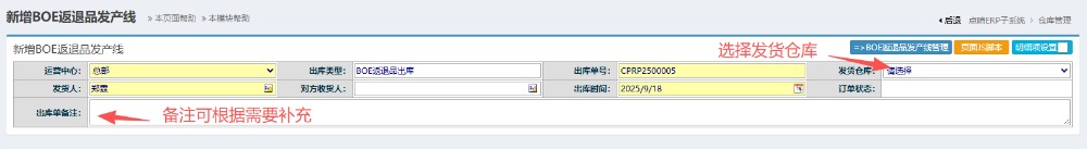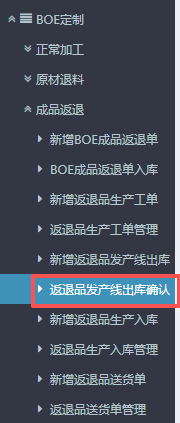 :点晴ERP-BOE返退品发产线出库流程![]() 1.进入ERP系统之后,在左侧的功能菜单里找到“BOE定制”,点开“成品返退”,点击“新增返退品发产线出库”。
