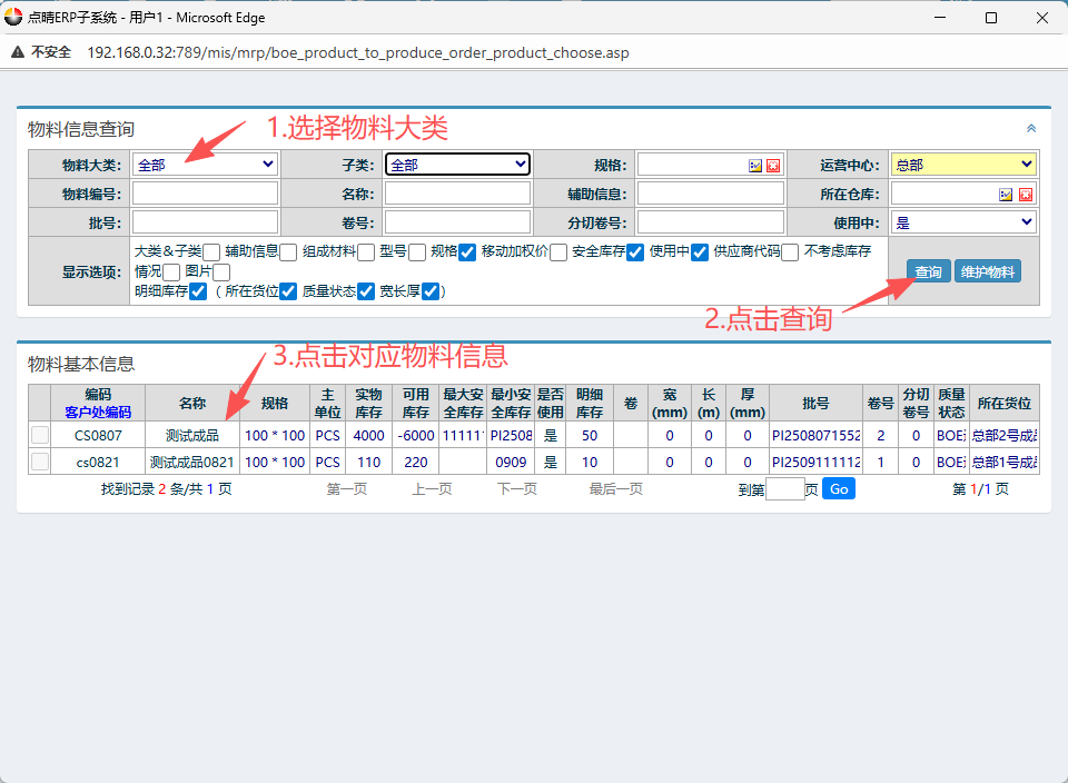 在弹出的物料信息窗口内,按图操作:点击选择物料大类,点击查询。然后点击对应物料信息。