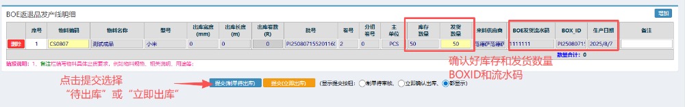 4.选好物料之后,检查确认库存和发货数量,以及BOXID和流水码。点击提交选择“待出库”或“立即出库”