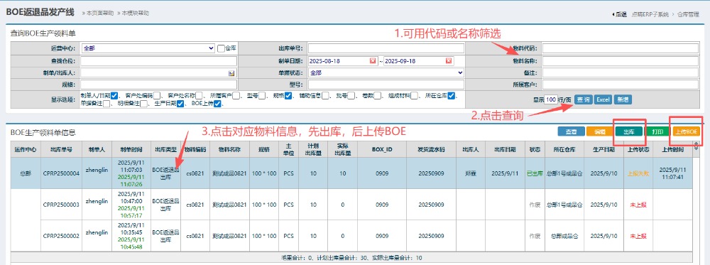 5.提交后,回到左侧功能菜单找到“返退品发产线出库确认”   6.进入界面后,按图操作:可用代码或名称筛选查找,点击查询。然后点击对应物料信息,先进行出库,再上传BOE