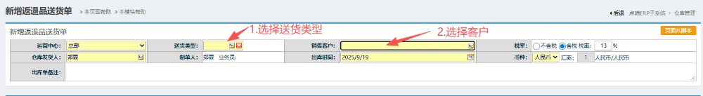 2.进入界面后,按图操作:点击选择送货类型,然后选择对应客户