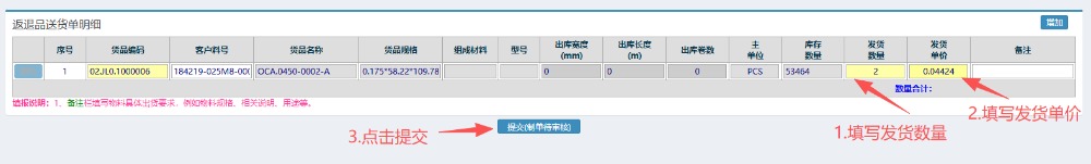 4.选好物料后,填写发货数量以及发货单价,然后点击提交