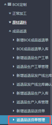 1.进入ERP系统之后,在左侧的功能菜单里找到“BOE定制”,点开“成品返退”,点击“新增返退品送货单”。