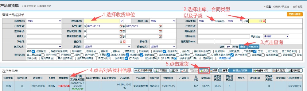6.进入界面后,按图操作:选择收货单位、出库和合同类型以及子类,点击查询。然后点击对应物料信息,再点击发货