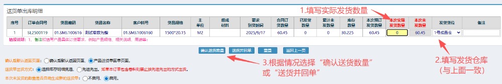 在发货界面内,按图操作:填写实际发货数量以及发货仓库(与上面一致),根据情况选择“确认送货数量”或“送货并回单”。