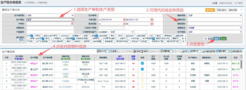 6.进入界面后,按图操作:选择生产单类型,可用代码或名称筛选。点击查询,确认当前生产单类型。