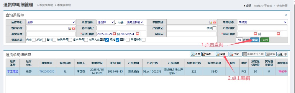点晴模切ERP-编辑销售退货单-操作流程