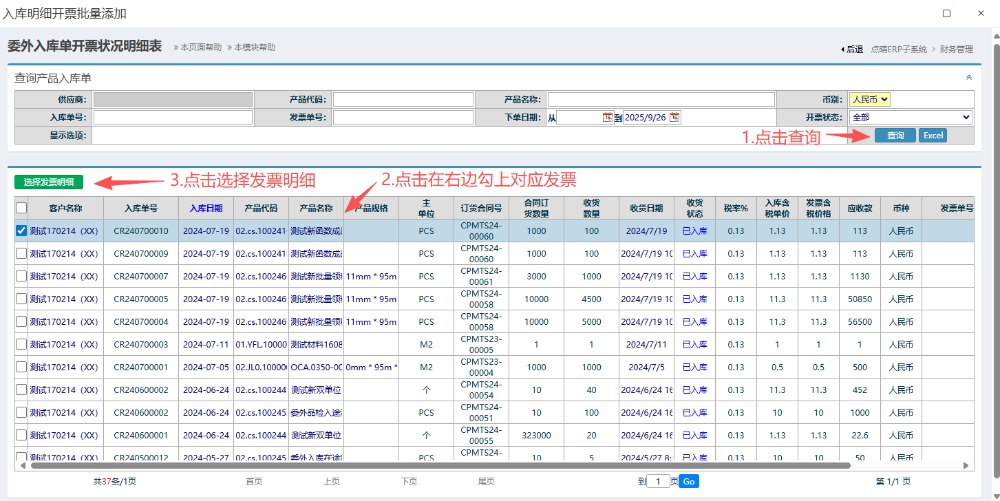 在弹出的信息窗口内,按图操作:先点击查询,然后在左边点击勾上对应的发票,最后点击“选择发票明细