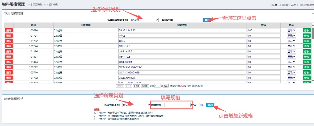 2.点开进入界面后,上方是进行规格查询的,点击选择物料类别,然后点击查询。 下方是新增规格的,也是同样选择物料类别,填写具体规格,然后点击增加。
