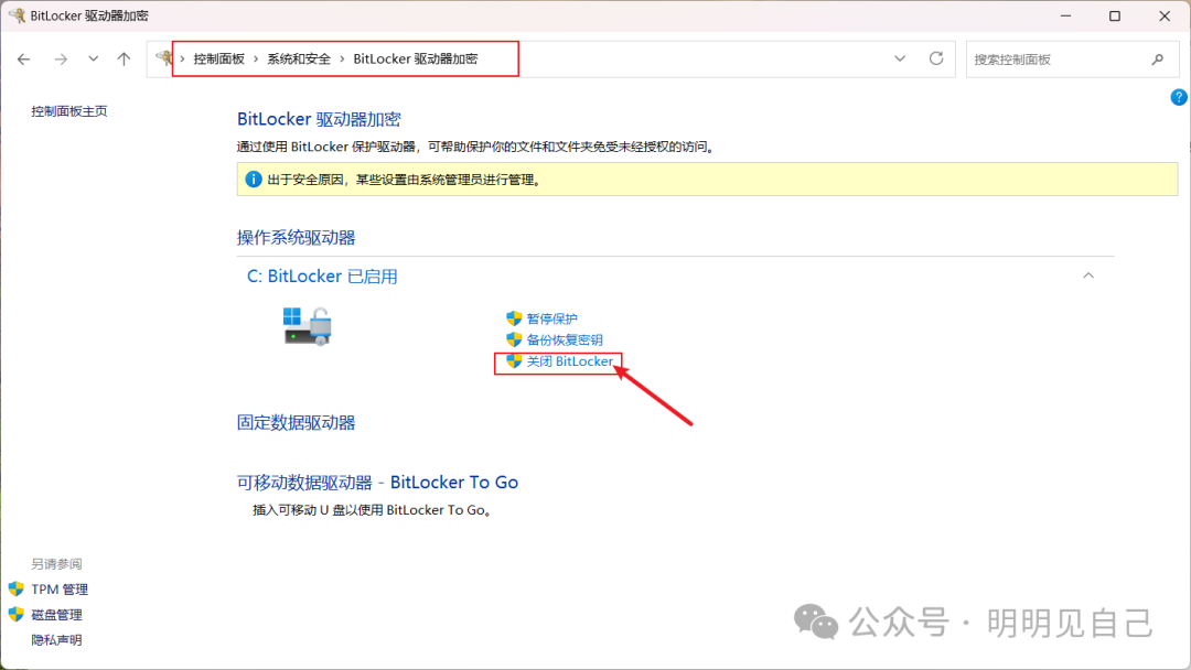 依次点「系统和安全→BitLocker 驱动器加密」,点击 C 盘右侧的「关闭 BitLocker」,系统会开始解密(根据 C 盘容量,可能要 10-30 分钟,别中途断电),解密完成后,C 盘的锁就消失了。