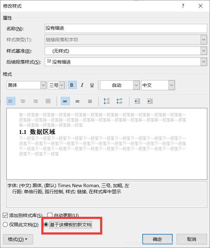 然后将一级标题的“样式基准”修改为新建的“没有缩进”。
