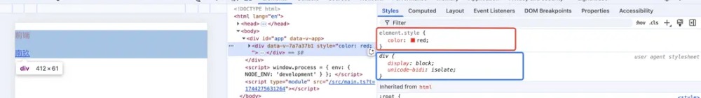 当前div既有开发者自定义声明样式(红框)也有用户代理样式(蓝框),这两块都属于声明值。