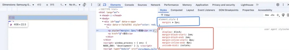 由于开发者自定义声明样式表与用户代理样式表都有定义margin值,最终应用的是开发者自定义声明样式表,所以开发者自定义声明样式表的权重要高于用户代理样式表