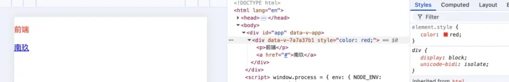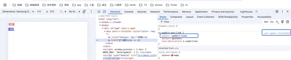同样还是上面的代码,我们可以看到对于p标签我们既没有声明他的文字颜色,用户代理样式表同样也没声明文字颜色,那么它的红色是从哪来的呢?