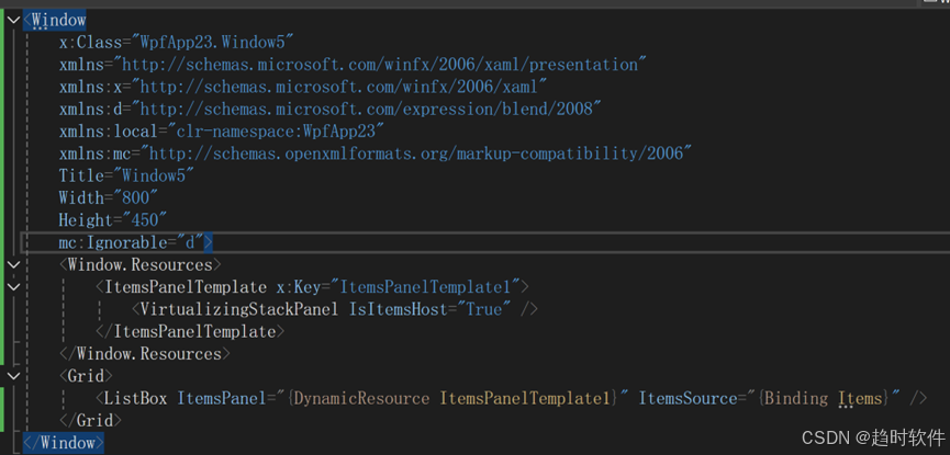 通过以上代码可以看出,ListBox有一个名为ItemsPanel的属性,在该属性中指定了一个Panel控件,ListBox在渲染时用该Panel来布局子项,我们要实现虚拟化只需要在ItemsPanel中指定VirtualizingStackPanel控件即可。